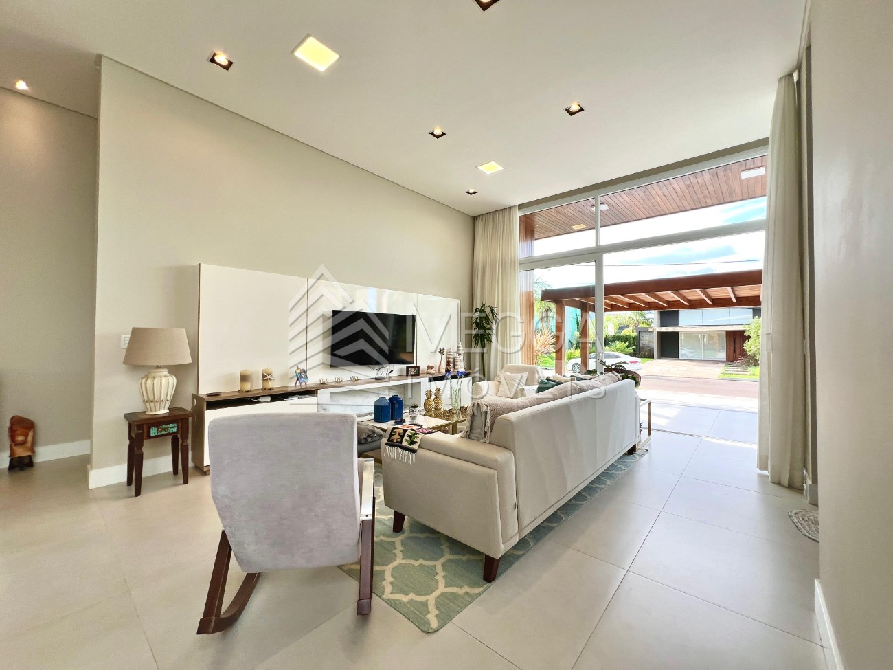 Megga Imóveis - Residência térrea, com orientação solar norte, composta de 04 suítes (sendo 02 americanas), aberturas emPVC com persianas automatizadas, amplo living com pé direito alto integrado a cozinha e sala de janta, lavabo, espaço gourmet com churrasqueira localizado mais ao fundo da casa, junto ao pátio e piscina; esperas para ar split, mobiliada e decorada, ótimo acabamento e alto padrão construtivo.