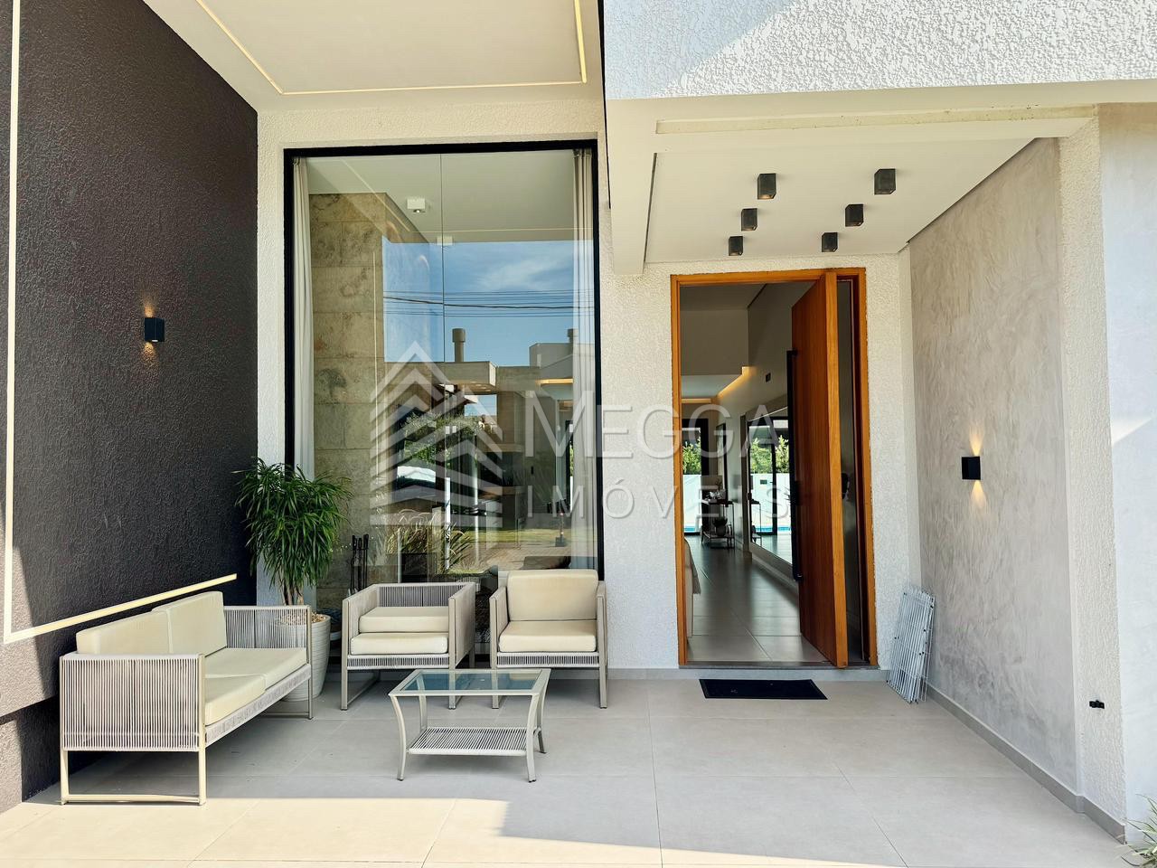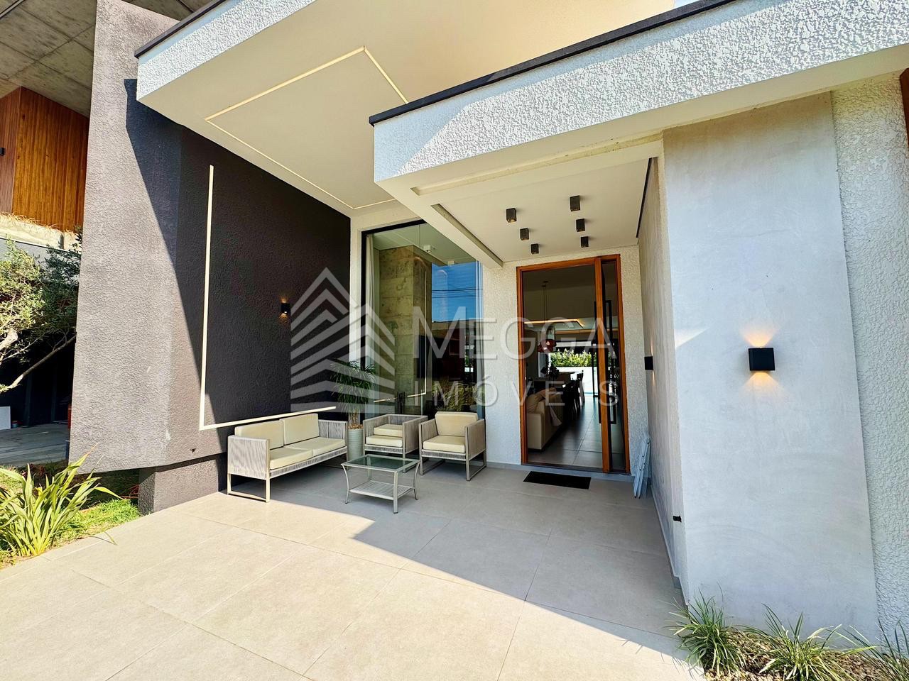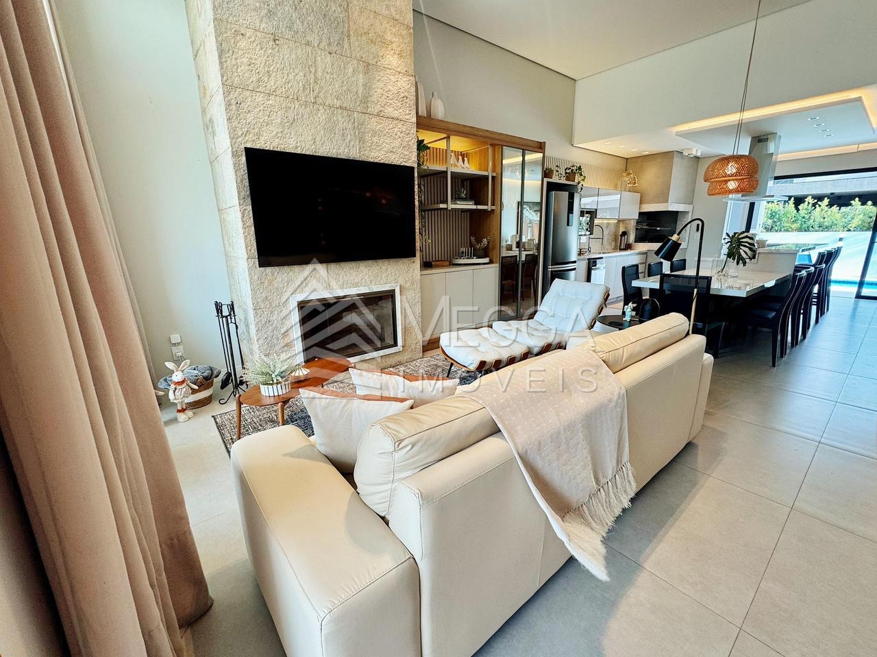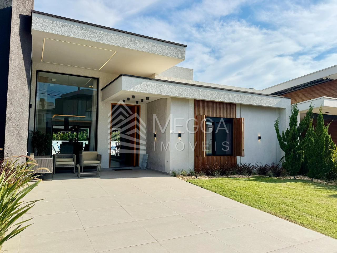 - Megga Imóveis - Casa térrea no Condomínio Blue - 4 suítes, sendo 2 americanas e 1 master - Living 3 ambientes - Sala de estar - Sala de jantar - Cozinha americana - Churrasqueira - Lareira - Lavabo - Lavanderia - Abrigo para carro