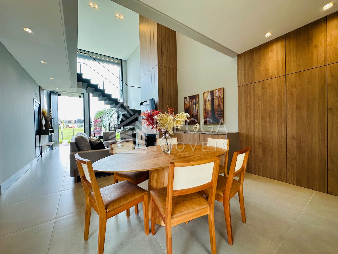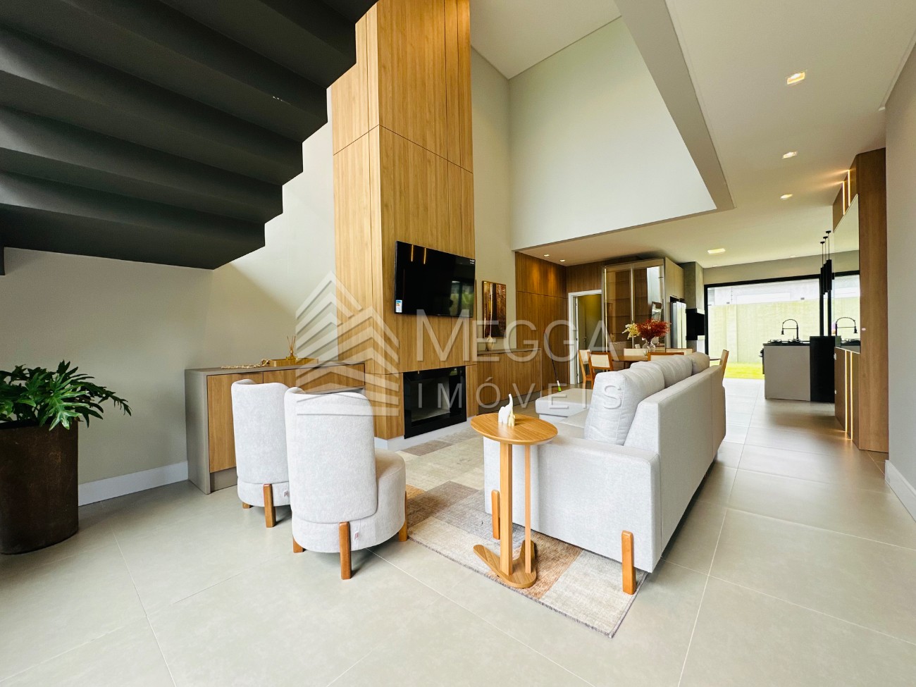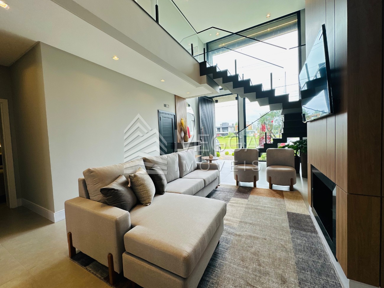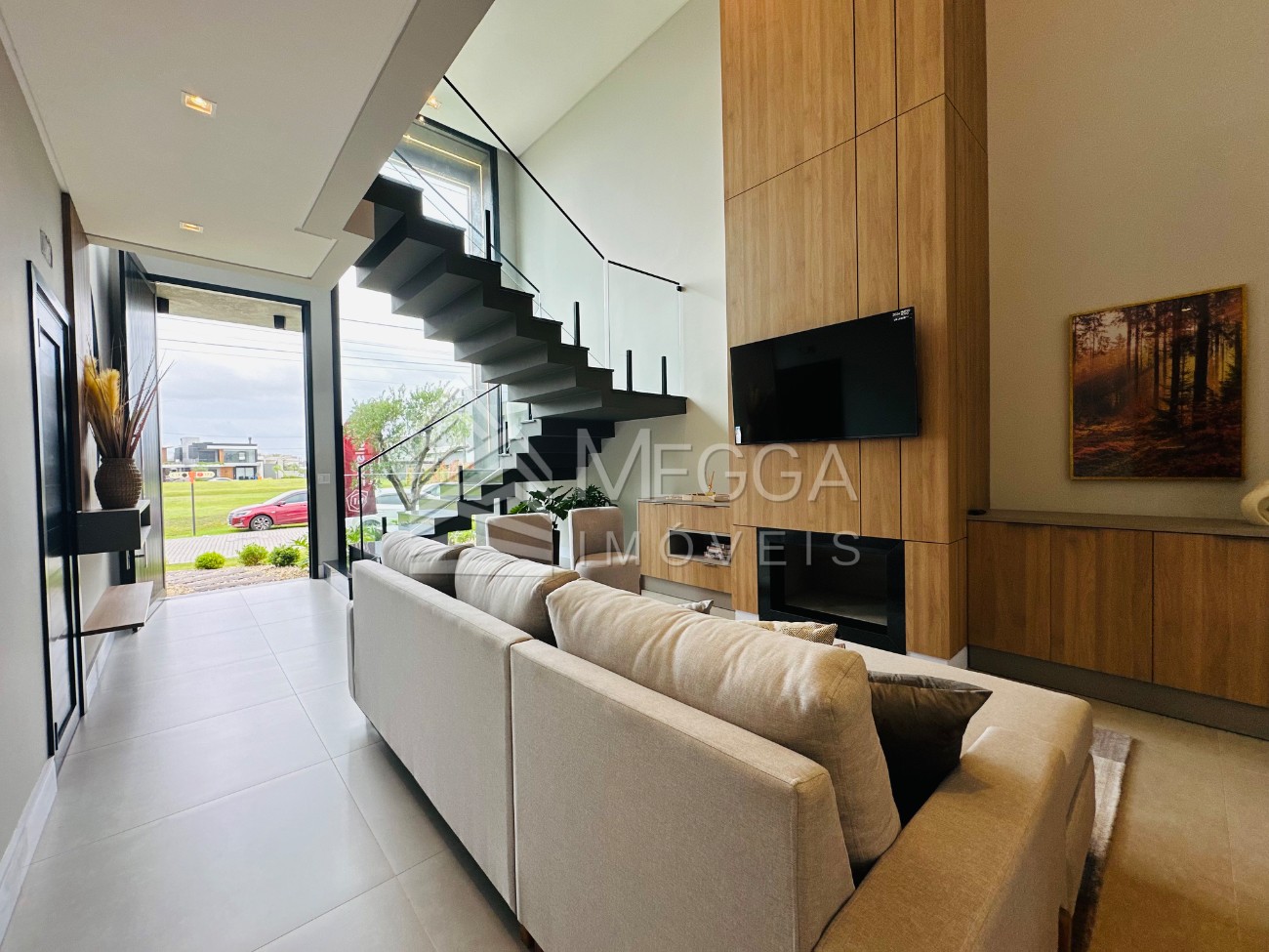 Megga Imóveis - Sobrado com excelente padrão construtivo a venda no Condomínio Sunset - Excelente padrão construtivo - 212 metros privativos - 04 suítes independentes - Sendo 01 suíte térrea - Living integrado em 02 ambientes - Lareira - Churrasqueira - Lavabo social - Área de serviço - Mobiliado e decorado - Espera para split - Vaga para 02 carros