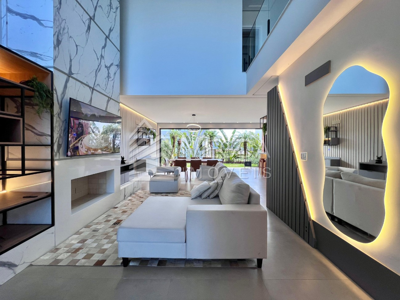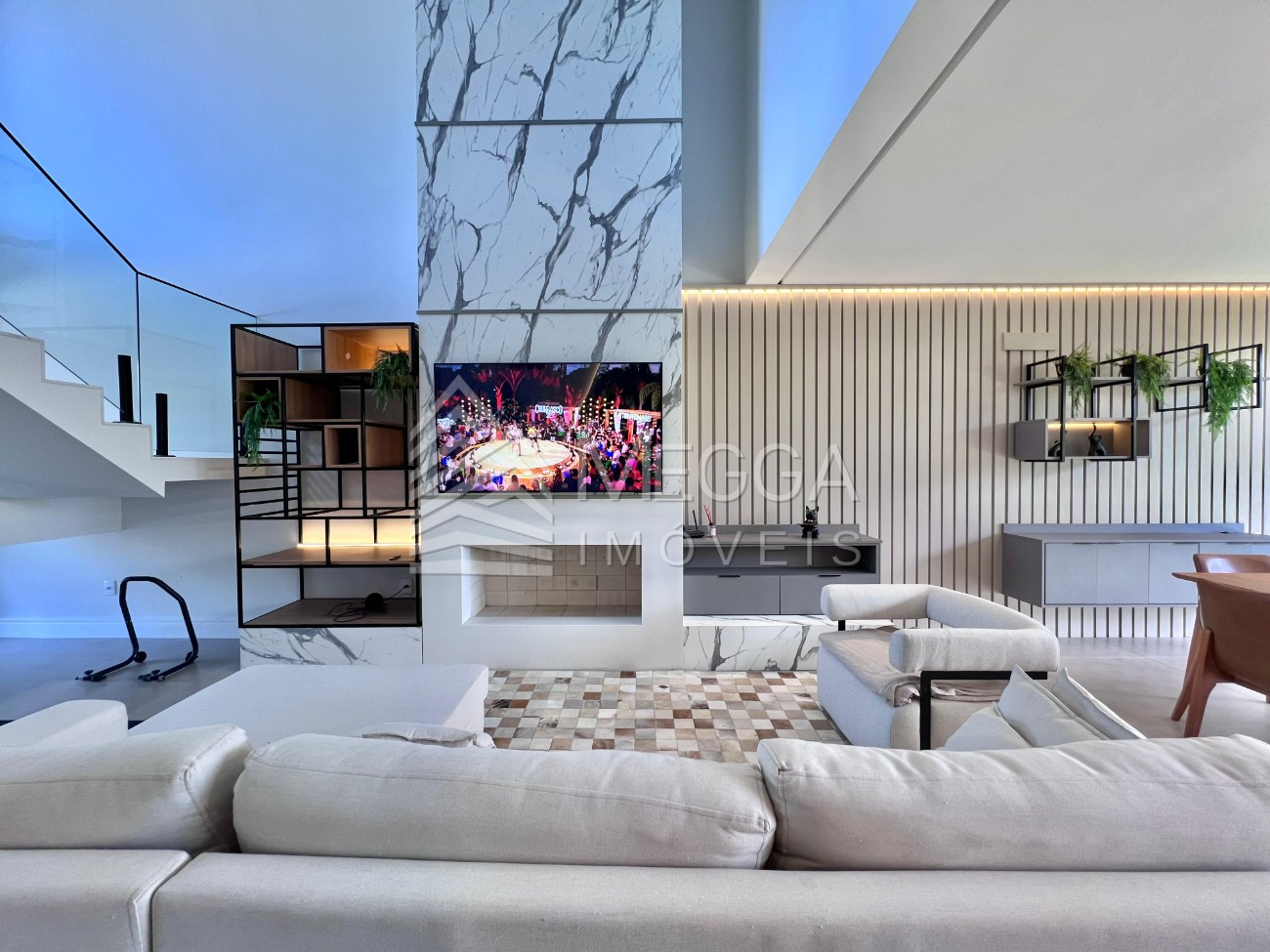 - MEGGA Imóveis - Casa no Condomínio Sunset - 4 suítes sendo 1 térrea - Living 3 ambientes - Sala de estar e jantar - Cozinha americana - Churrasqueira - Lavabo - Área de serviço - Piscina - Paisagismo - Vaga para 2 carros