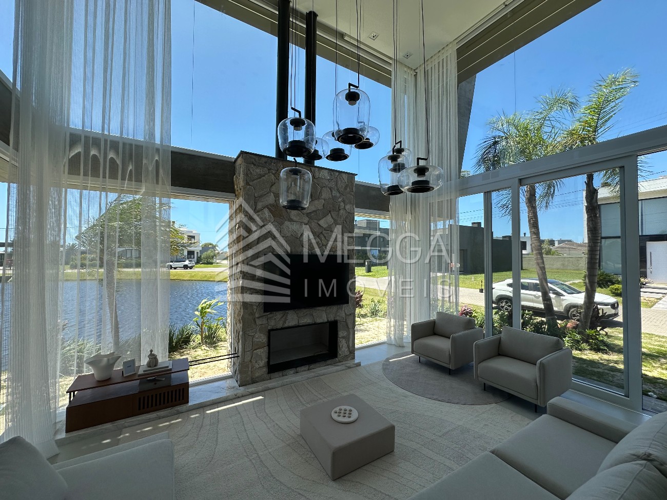 - LIVING com pé direito duplo, lareira, sendo 91m2 envidraçado com linda vista do lago