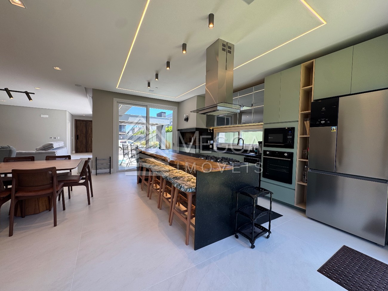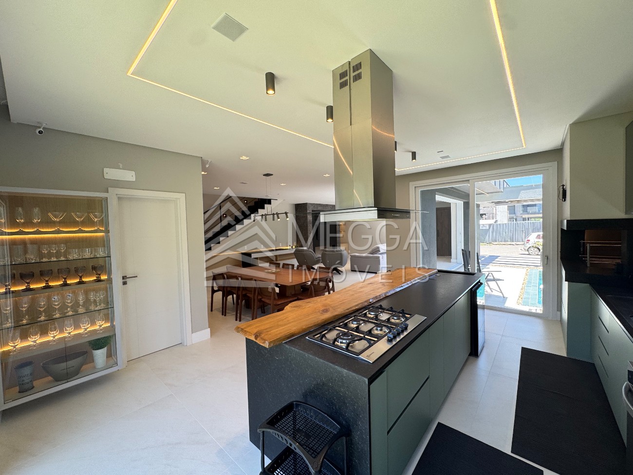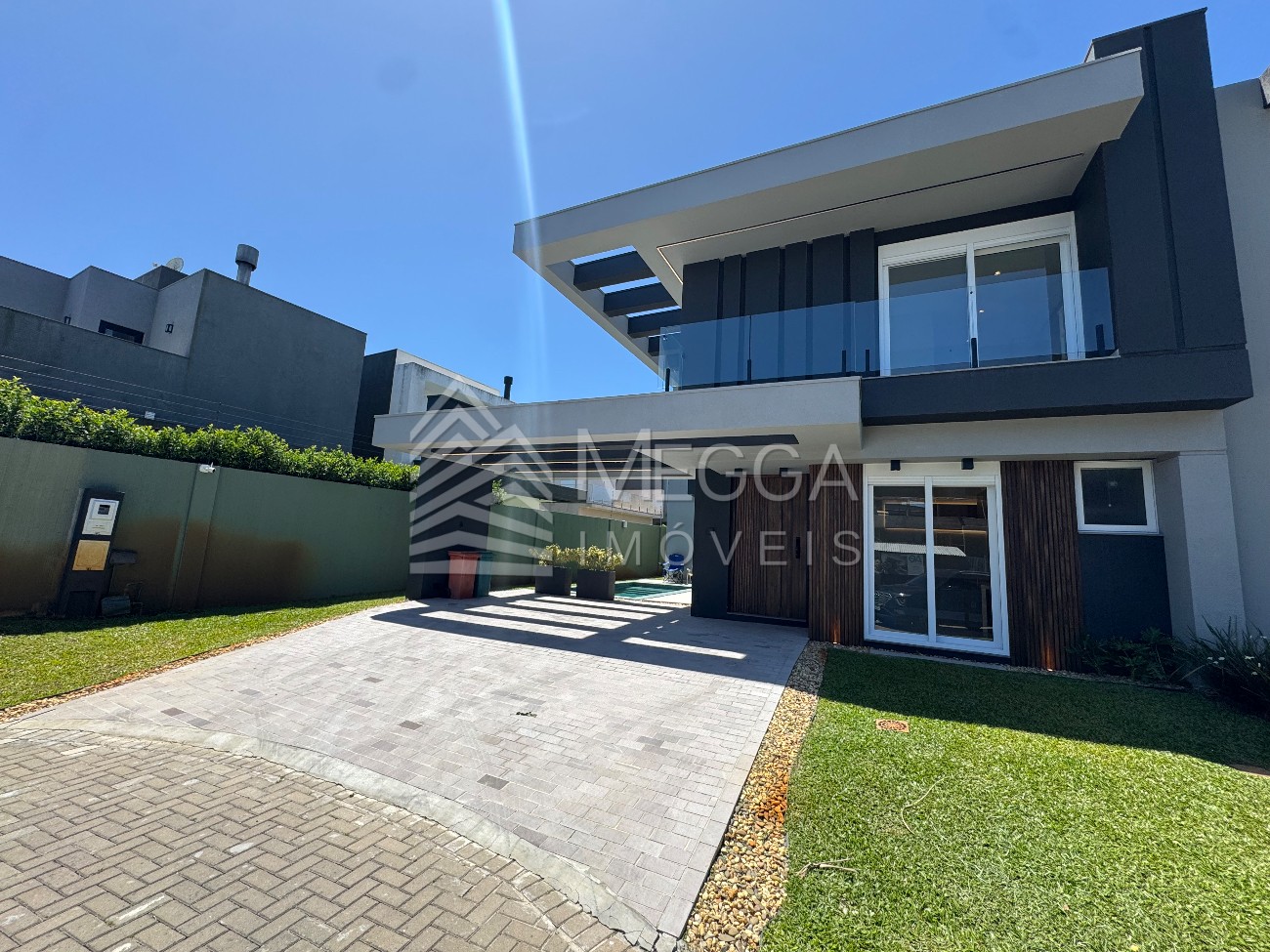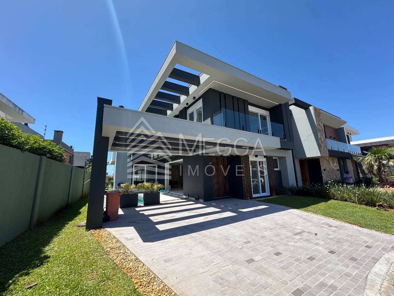 - Megga Imóveis - Casa no condomínio Sunset - Próximo ao clube - 5 suítes, sendo 1 térrea - Amplo living - Lareira - Churrasqueira - Lavabo - Lavanderia - Piscina - Piso aquecido - Cortinas automatizadas - Sistema de segurança - Iluminação externa automatizada - Abrigo para 2 carros - Espera para carregamento elétrico - Excelente posição solar