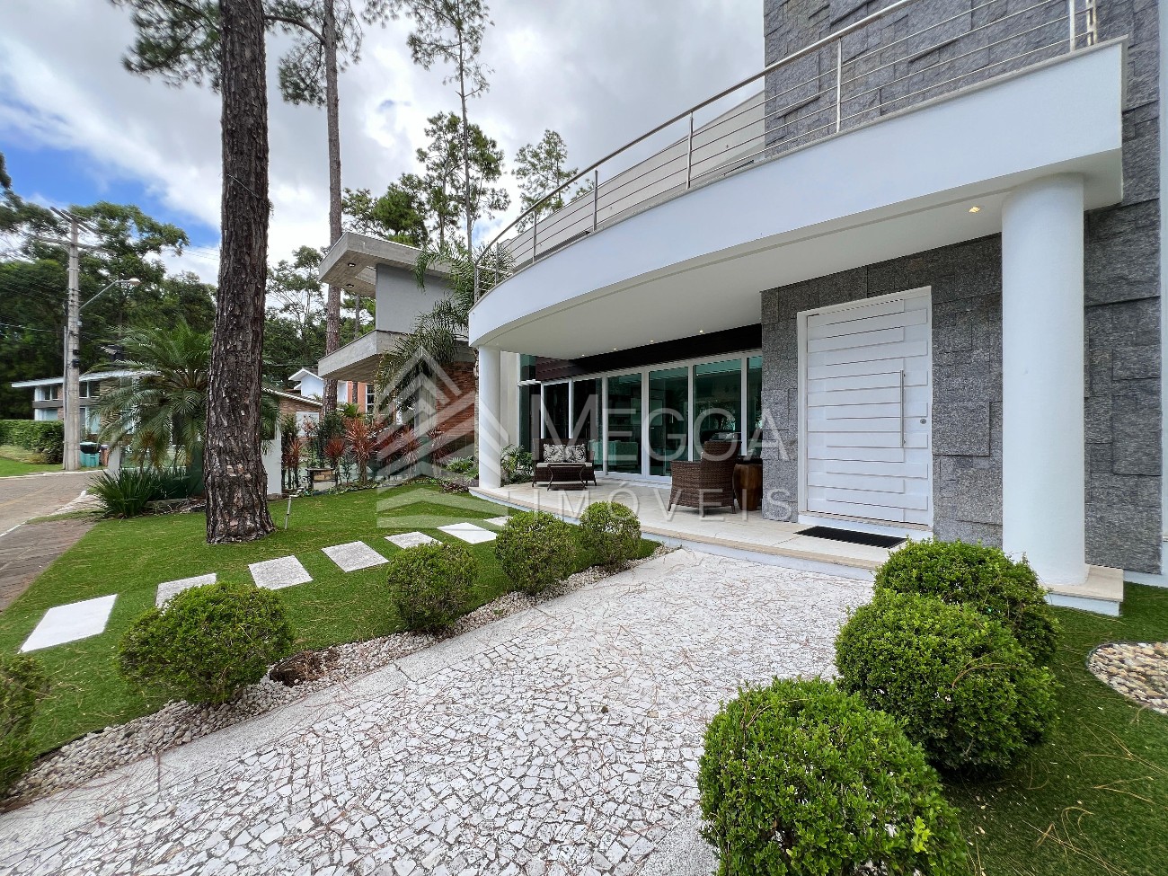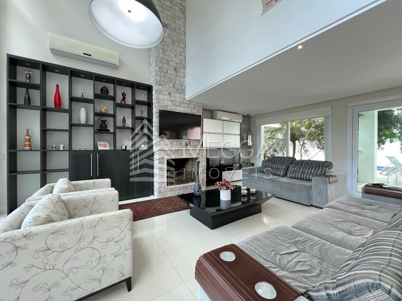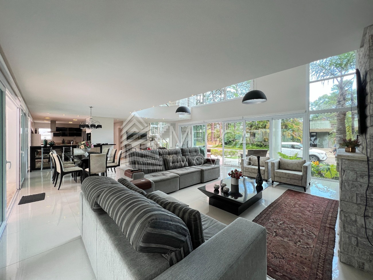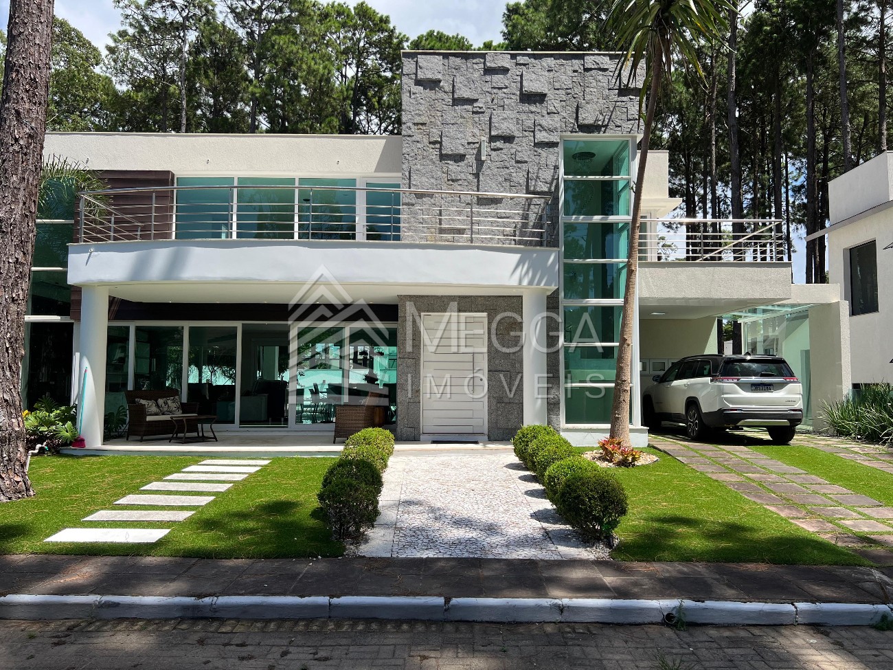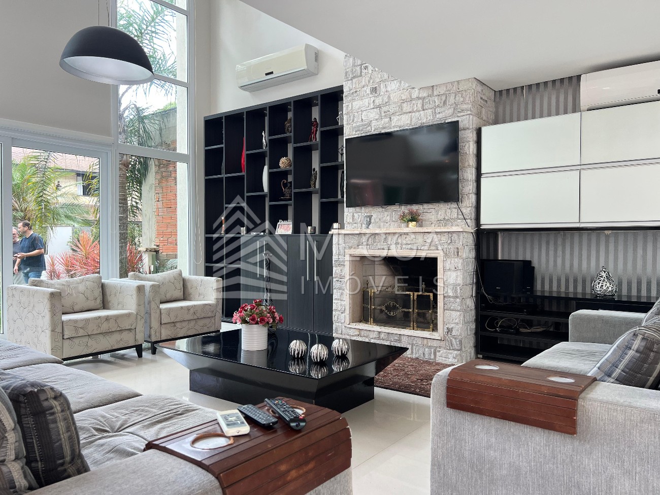 - Megga Imóveis - Sobrado no Condomínio Carmel - 4 suítes, sendo 1 master - Churrasqueira interna e externa - Lareira - Dependência de empregada - Living integrados - Bar molhado - Piscina - Vaga para 1 carro - Decorado e mobiliado
